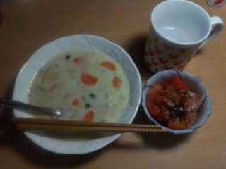 スパゲティをゆでて絡めてもよかったのですが…まだ炭水化物は控えておこうということでシチューonlyです☆
