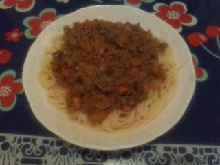 挽き肉地獄の最後を飾りました、ミートスパゲティーです☆人参、タマネギ、ピーマンをみじん切りにするのが面倒でしたが…作ってしまうと楽ですね(≧∀≦)♪後はパスタを茹でて絡めるだけ☆