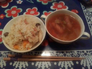 かめの作成のミネステローネとピラフを食べた後、今はかめのの帰りを待つばかりです♪