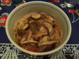 昨日の晩ご飯・ミネステローネにさらにトマトとナス、しめじを加えてパスタに絡めてみました☆フェニックススープパスタです(≧∀≦)