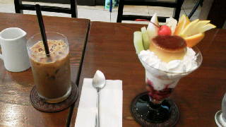 最近はとみに暑いのでひんやり系のプリンパフェを注文☆プリンの下にバニラアイスがあり、底にはベリーの酸味が効いたソースが隠れていて、涼しくあっさりと食べられるパフェでした♪大きさも程よく食べ頃サイズなのも良かったです。店内は茶色を基調とした落ち着いた雰囲気でBGMもクラシックで統一されていて中々寛げる空間でした(>_<)
