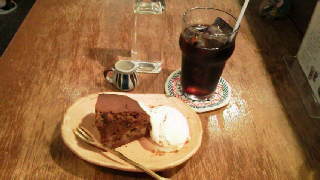スパイシーなカレーの強い誘惑を振り切って今回はケーキとアイスコーヒーを頼みました。シナモンやナツメグ、ジンジャーを練り込んだ生地にバナナが入ったケーキで、少し温めてあり、ほっこりとした気分に浸れました☆